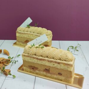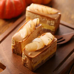 なめらかな和紅茶のムースとアールグレイ香るスポンジケーキ。間には赤ワインでコンポートしたいちじくで食感を演出。トップのクリームには、和紅茶とガナッシュのスペシャルなクリームを。