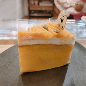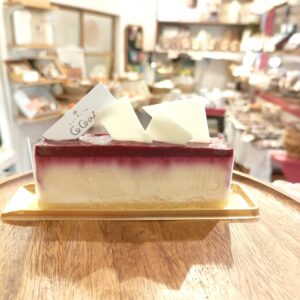 カラメルのような香ばしい焼き面と、フォークを入れればとろりとした食感の米粉のチーズケーキ。お芋の優しい甘さが際立つケーキです。